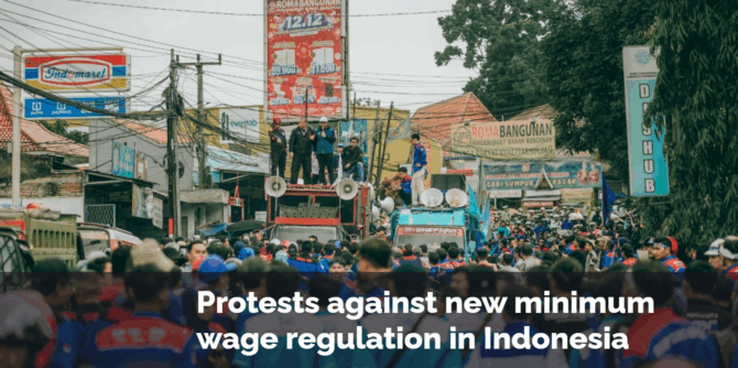 「ジャカルタ、西ジャワ、バンテンの何万もの労働者が、最低賃金問題を掲げて街頭に繰り出している。政府は新しい規則を廃止しなければならない。この規則は、生活費が上昇しているにもかかわらず一部の地域で賃上げ見送りを招く可能性があり、生活賃金に深刻な脅威をもたらすからだ。この規則は憲法裁判所の判決にも反する」
